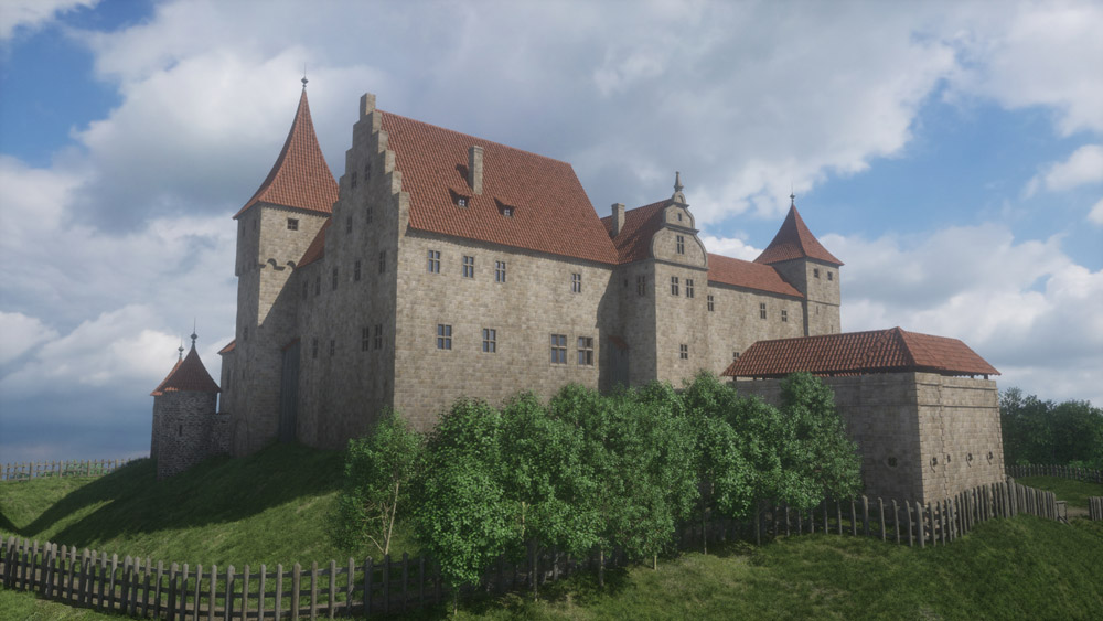 Based on the 3D survey data and archaeological-historical specifications, such as floor plans and drawings, the multimedia specialists create 3D reconstructions with a high level of detail and credible authenticity. In a multi-stage process, we initially defined the rough geometry of the buildings and then continued with reconstructing the details. Subsequently, the objects received suitable and realistic textures and in a final step the landscape around the castle or motte was visualised.